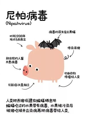 尼帕病毒病首次发现于1998年12月-1999年5月马来西亚、新加坡,后续在孟加拉国、印度多次暴发。是由尼帕病毒引起的高致死性人畜共患传染病,主要通过果蝠、生猪传播,也可人传人,病死率40%-75%,重在预防。尼帕病毒属副粘病毒科亨尼帕病毒属,单股负链RNA病毒,可在多种哺乳动物细胞中生长增殖,尼帕病毒的宿主范围很广,包括蝙蝠、猪、马和人等。