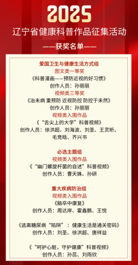 近日,由辽宁省卫生健康委、省疾病预防控制局、省总工会和省科协联合举办的“2025年辽宁省健康科普作品征集活动”结果正式揭晓,锦医三院选送的多部健康科普作品凭借专业的内容内核、创新的传播形式和显著的社会价值,从全省众多参赛作品中脱颖而出,斩获多项荣誉。